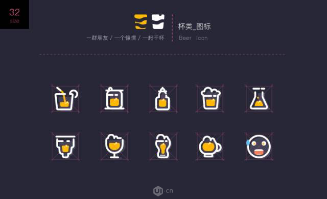 整体风格的统一:我这次设计是一套杯子的图标,为了统一风格我将所有线条的粗细都设置为 2 px,然后做了偏 MBE 风格的设计。为了能让所有杯子统一,我在杯子里加入了酒,所以整套图标也就成了装酒的各种瓶子和杯子。而点小气泡就是为了增加了一种趣味性且更统一。